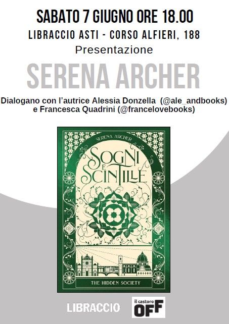 Sabato 7 giugno, al Libraccio di corso Alfieri ad Asti, verrà presentato il libro “Sogni e scintille”, il primo romanzo di Serena Archer, altro tassello della serie “The Hidden Society”, scritta dalle sorelle Jude e Ella Archer.