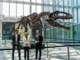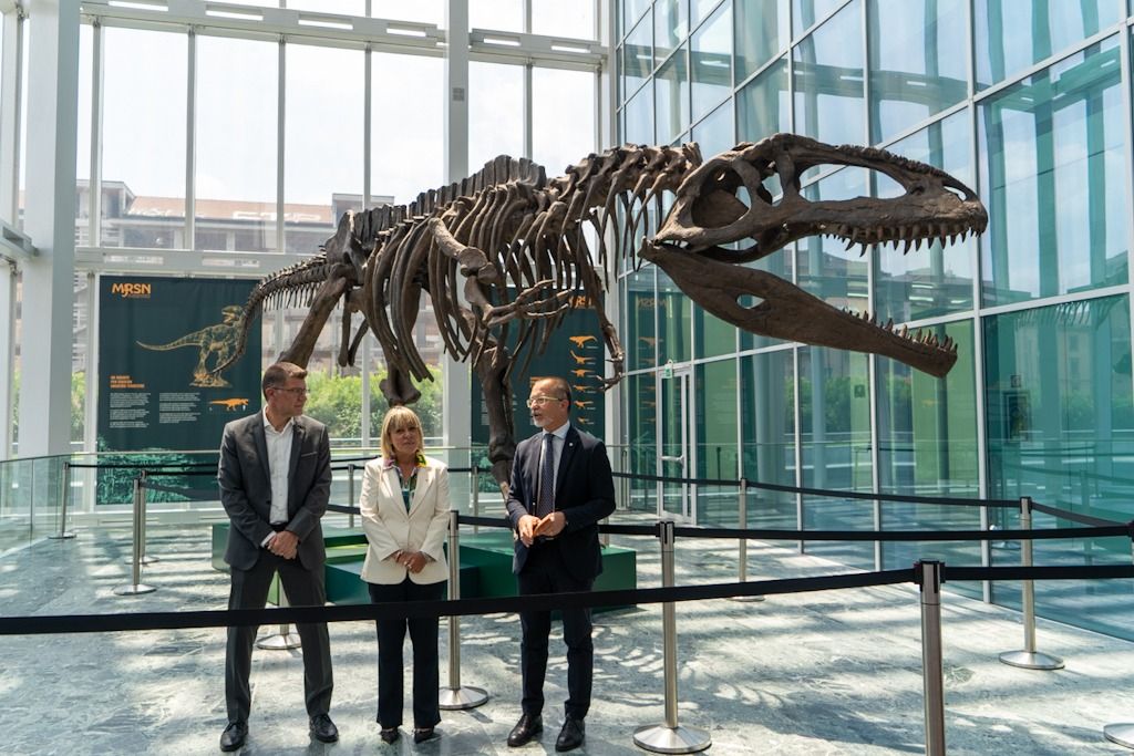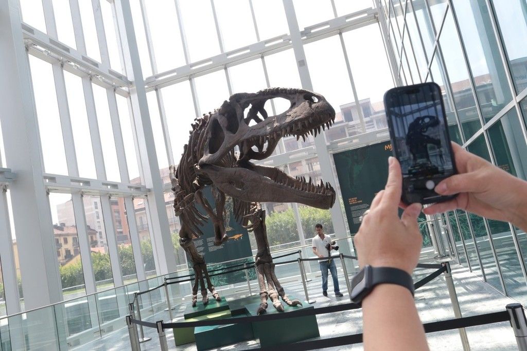 Una fedele copia in resina di un Giganotosauro campeggia all'ingresso del grattacielo della Regione Piemonte. Una riproduzione in scala reale di uno dei carnivori più grandi e feroci, predatore della Patagonia.