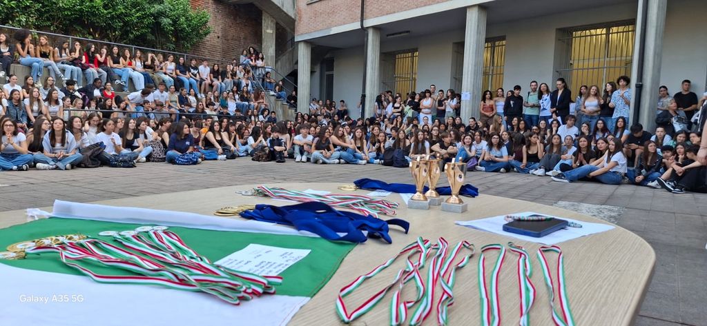 Dalle 8 alle 11.30, nel cortile della succursale dell’istituto, in via Gabiani, con gli studenti suddivisi in due turni per rispettare i limiti di capienza dell’edificio, sono state consegnate le borse di studio conferite per l’anno scolastico 2023/2024 e, contestualmente, sono stati assegnati riconoscimenti ad allieve e allievi che, nel corso dell’anno scolastico 2024/2025, si sono distinti rappresentando l’istituto nelle diverse competizioni sportive, non soltanto a livello provinciale, ma anche regionale o addirittura nazionale (le rappresentative di scacchi), ovvero impegnandosi in attività culturali e sociali: in totale, circa un centinaio di premiati, a testimonianza della vivacità della nostra popolazione studentesca, accompagnati dagli applausi e dal “tifo” di compagne e compagni.