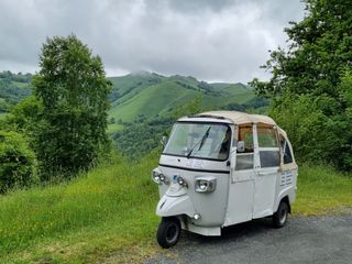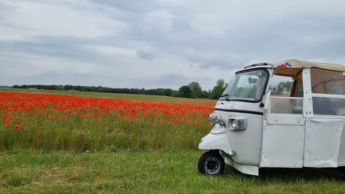 Il viaggio lento e sognato di Andrew Blundell, partito dall’Inghilterra sul suo Ape Calessino 200: tappa d’obbligo nella terra del vino e dei tartufi