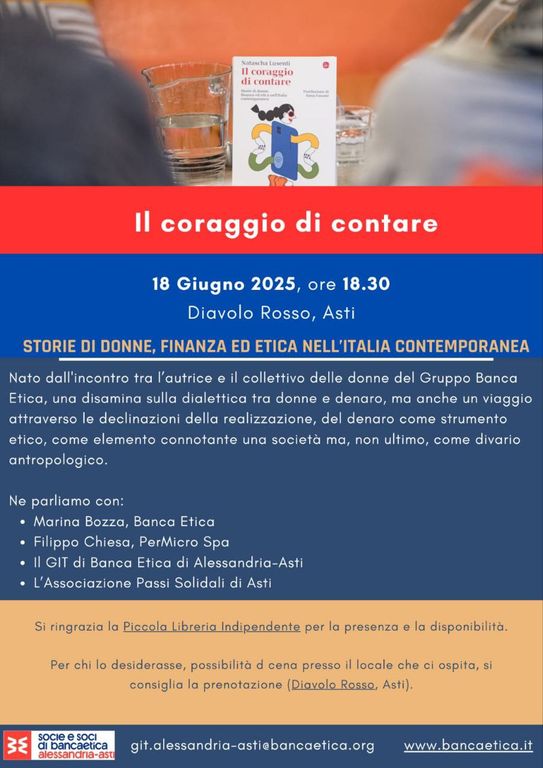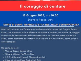Mercoledì 18 giugno alle 18.30, al Diavolo Rosso di Asti, si terrà la presentazione del libro di Natascha Lusenti “Il coraggio di contare: Storie di donne, finanza ed etica nell'Italia contemporanea”.