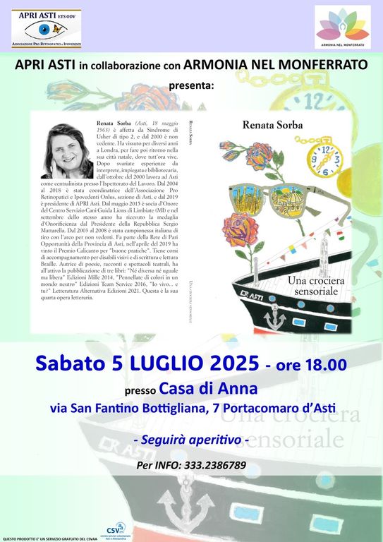 Doppia presentazione per "Una crociera sensoriale", quarta fatica letteraria di Renata Sorba, referente della sezione astigiana dell'Associazione Pro Retinopatici e Ipovedenti (Apri). L'opera nasce per raccontare un'esperienza di viaggio da una prospettiva unica: quella di una persona non vedente.