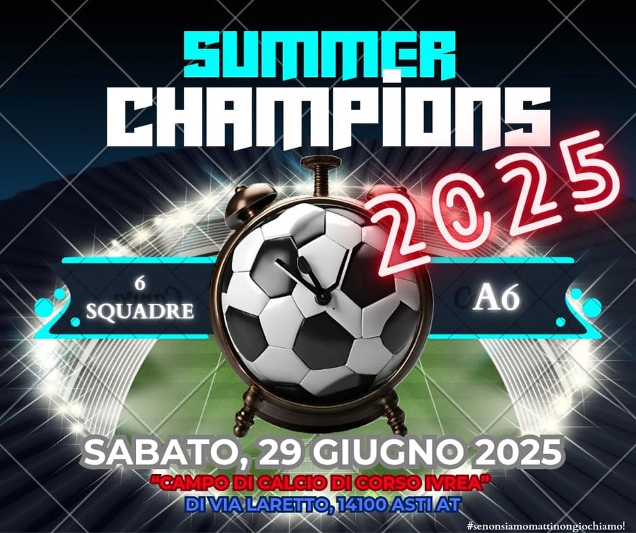 Tutto pronto per l'edizione 2025 della Summer Champions, il torneo amatoriale di calcio a 6 che sabato 28 giugno animerà il quartiere Torretta di Asti. Sul campo sintetico di Via Laretto si sfideranno 6 squadre composte da oltre 60 partecipanti, in una giornata dedicata allo sport e al divertimento.