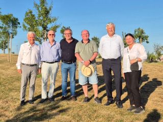 [Da sinistra: il sindaco di Cherasco Claudio Bogetti, il direttore di Ascom Bra Luigi Barbero, l'Assessore regionale Marco Gallo, il fondatore di Tesisquare Giuseppe Pacotto, il presidente di Confondustria Cuneo Mariano Costamagna e la vicepresidente di Fondazione DIG 421 Marcella Brizio]
