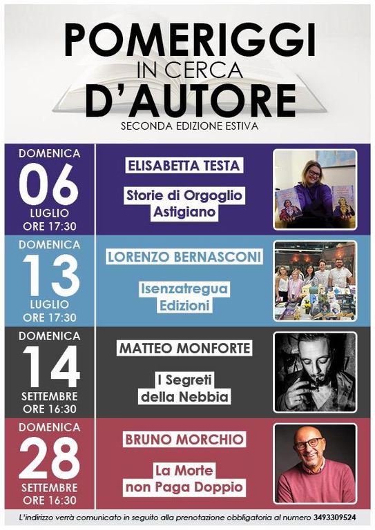 Domenica 13 luglio alle 17.30 sarà la volta di Lorenzo Bernasconi (Isenzatregua Edizioni). Domenica 14 settembre alle 16.30 Matteo Monforte (I Segreti della Nebbia). A chiudere la rassegna domenica 28 settembre alle 16.30 Bruno Morchio (La Morte non paga doppio).