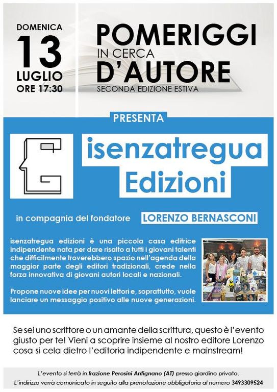 Dopo la presentazione delle "Storie di Orgoglio Astigiano" di Elisabetta Testa la scorsa domenica, il 13 luglio sarà la volta di Lorenzo Bernasconi (Isenzatregua Edizioni).