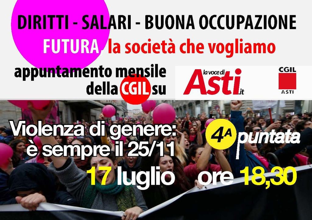 Un tema che non può attendere il 25 novembre per essere affrontato. Giovedì 17 luglio alle 18:30 torna "Futura... La società che vogliamo", la trasmissione promossa dalla CGIL Asti in collaborazione con La voce di Asti, per la quarta puntata che sarà dedicata alla violenza di genere con focus sul mondo del lavoro.