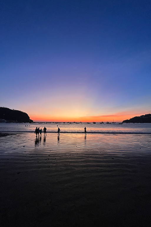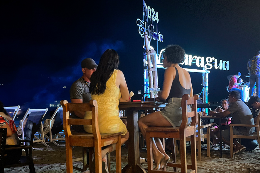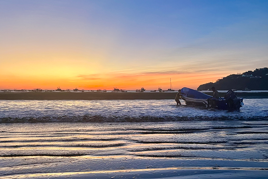 Al tramonto, San Juan si adagia nella sua conca come una creatura stanca che trova finalmente riposo. Il villaggio si scalda: i muri delle case diventano arancio tenue, le lamiere dei tetti riflettono bagliori intermittenti. La sabbia, liscia come velluto, separa l’oceano dal paese con una curva perfetta. Le barche restano ferme sull’acqua, allineate come note su uno spartito. La luce si allunga attraversa le palme e accarezza i volti di chi resta seduto a guardare, mentre sulla spiaggia vengono accesi i primi falò. È un momento in cui tutto sembra rallentare, come se il villaggio si fermasse per un istante a contemplare sé stesso, prima di tornare a vibrare. La sera, tutto si trasforma. I blackout spezzano il ritmo, le torce aprono varchi tra le ombre. Nei bar si balla, si beve, si dimentica. Le risate si confondono con la musica, gli sguardi si intrecciano come in una città di frontiera. Il turismo qui ha un accento preciso: quello nordamericano. Canadese, per lo più, e statunitense. Molti arrivano dal sud della California, zaino in spalla, tavola da surf sotto il braccio, e quella fame di esotico a buon mercato che trova qui una risposta semplice: onde, rum, tramonti. Sono giovani, spesso in pausa da qualcosa: un lavoro, un’università, una relazione. Cercano libertà e leggerezza, e San Juan gliele concede volentieri. C’è un’assenza che si nota. L’Europa è lontana, non solo geograficamente. Mancano i turisti che osservano prima di ordinare, che si portano dietro la voglia di capire più che di conquistare. Questo, forse, contribuisce a creare un piccolo paradosso: San Juan è Nicaragua, ma a tratti sembra una bolla scollegata dal resto del Paese. Una stazione di sosta per viaggiatori in cerca di qualcosa, ma non sempre sicuri di cosa.