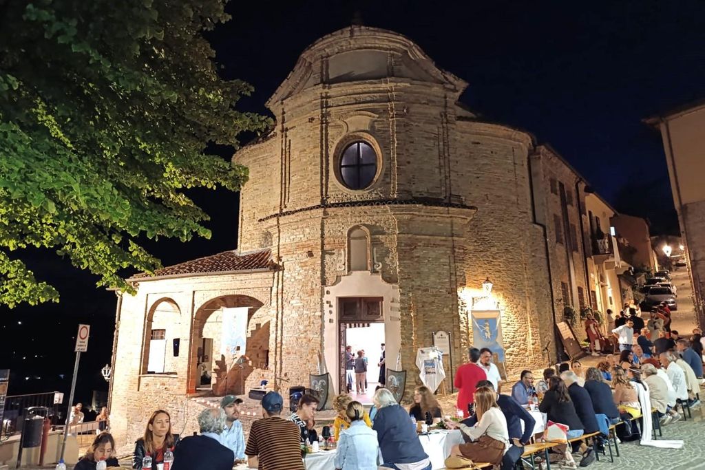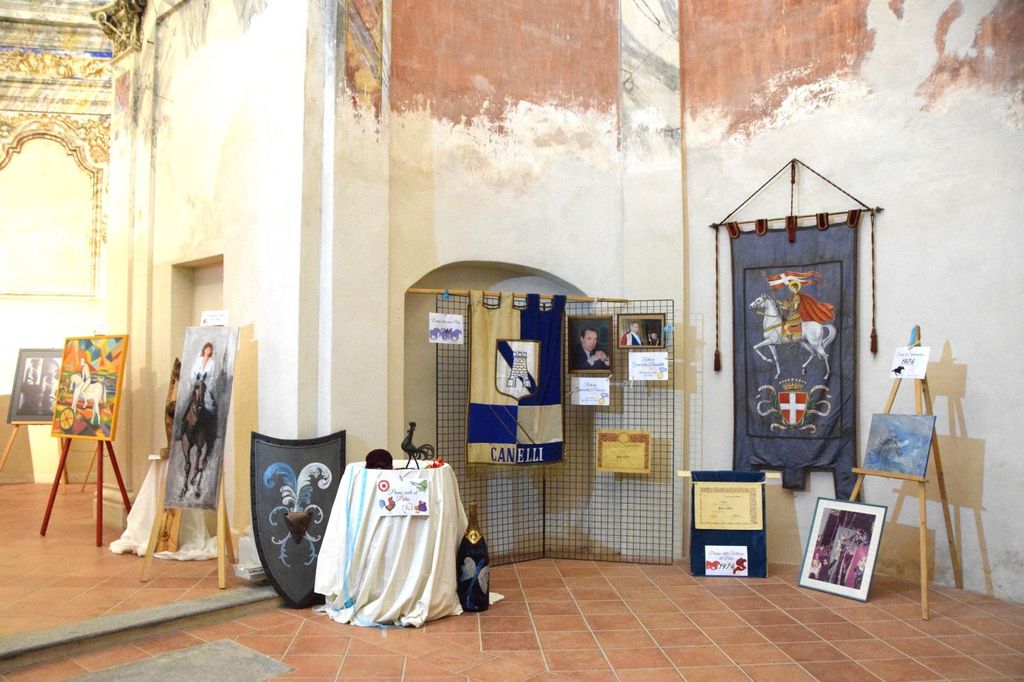 Accanto alla cena, la Chiesa di San Rocco ha ospitato una mostra dedicata al Palio canellese, con cimeli della famiglia Pulacini, foto storiche dell’Associazione Memoria Viva e persino il drappo vinto nel 1974. Le pareti hanno accolto anche le opere degli artisti locali, mentre i visitatori hanno potuto degustare un calice di Canelli DOCG offerto dall’Enoteca Regionale.