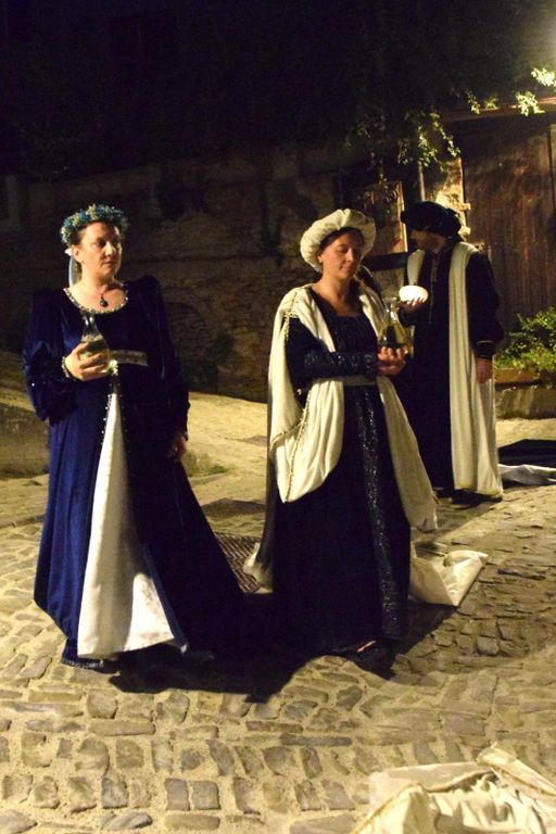 La serata si è accesa con la sfilata dei figuranti, vestiti con i costumi medievali dell’atelier Principessa Valentina e accompagnati dai tamburi di Dino Zanatta. Spade, duelli scenici dell’Asti Buhurt Club e giochi antichi curati dalla Comunità Pastorale Cristo Vera Vite hanno trasformato la piazza in un racconto vivente. Le letture di Aldo Delaude e Rosangela Pescarmona hanno evocato il tema che Canelli porterà alla sfilata del Palio di Asti 2025: “Conviti et bacanali in chiesa: la medievale Confraria dello Spirito Santo a Canelli”, ideato da Gianluigi Bera.