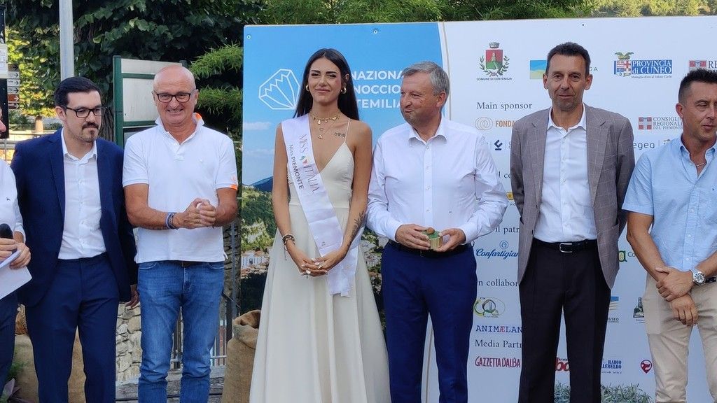 Miss Piemonte 2024 Francesca Spinelli ha consegnato il premio Nocciola d’Oro a Ezio Raviola ex presidente Fondazione CRC oggi funzionario della Fondazione Compagnia San Paolo e al notissimo pasticcere romano Davide Dalizia, più volte campione del mondo di pasticceria.