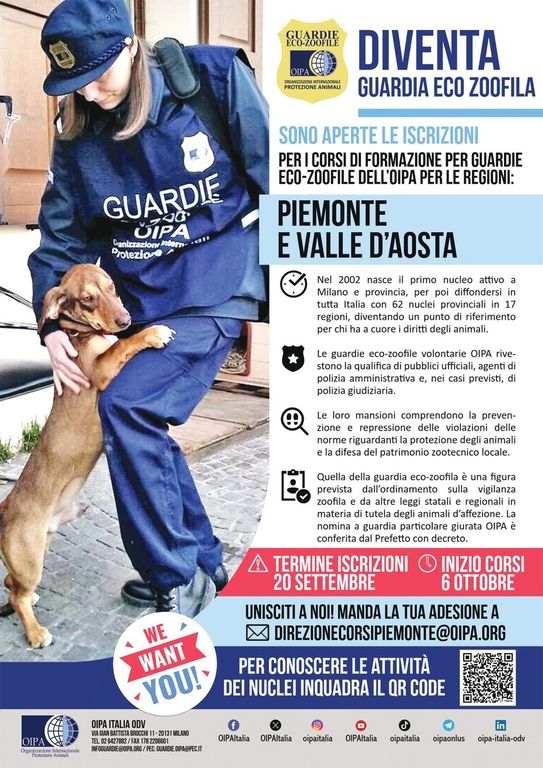 Aperte le iscrizioni ai corsi di formazione per diventare guardia zoofila dell’Organizzazione internazionale protezione animali (OIPA) in Piemonte e Valle d’Aosta, una figura prevista per la tutela degli animali d’affezione, la cui nomina è conferita tramite decreto del Prefetto.