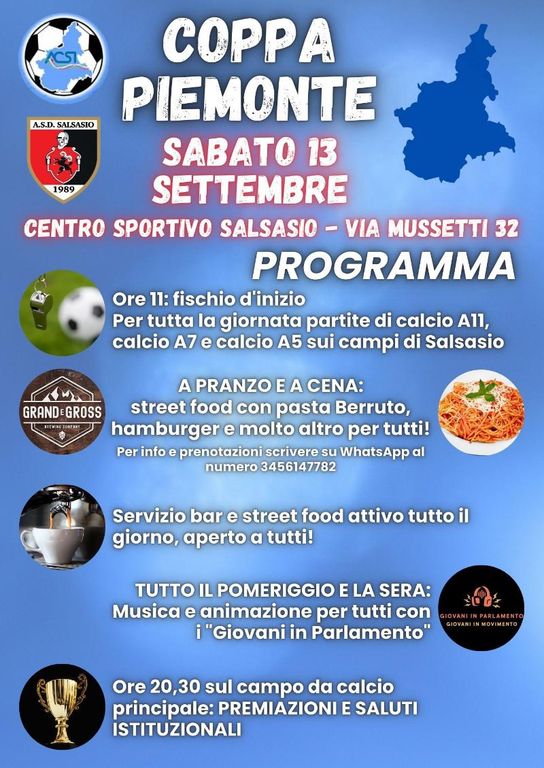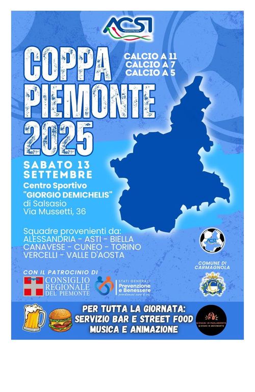 Sarà una giornata di sport, musica e divertimento quella di sabato 13 settembre, quando il centro sportivo di Salsasio, in via Mussetti 32 a Carmagnola, ospiterà la Coppa Piemonte ACSI.