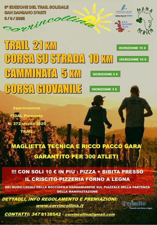 San Damiano d’Asti si prepara ad accogliere la grande festa dello sport e della solidarietà con l’ottava edizione di “Corrincollina”, in programma sabato 6 settembre 2025. L’evento, organizzato dall’A.S.D. Hammer Team con il sostegno di Mama Africa e sotto l’approvazione FIDAL Piemonte, propone un ricco programma capace di coinvolgere atleti, appassionati e famiglie.