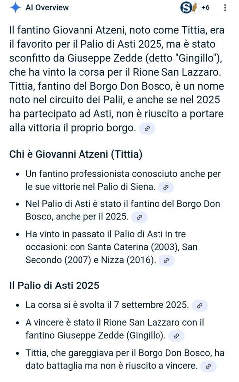 Secondo i responsi dell' Ai, Giuseppe Zedde detto Gingillo avrebbe già vinto il Palio di Asti 2025 per il Rione San Lazzaro. Non solo: il povero Giovanni Atzeni, alias Tittia, sarebbe già stato sconfitto, nonostante la corsa debba ancora partire. Una specie di spoiler storico, insomma, con tanto di cronaca dettagliata di un evento che si terrà solo tra qualche ora.