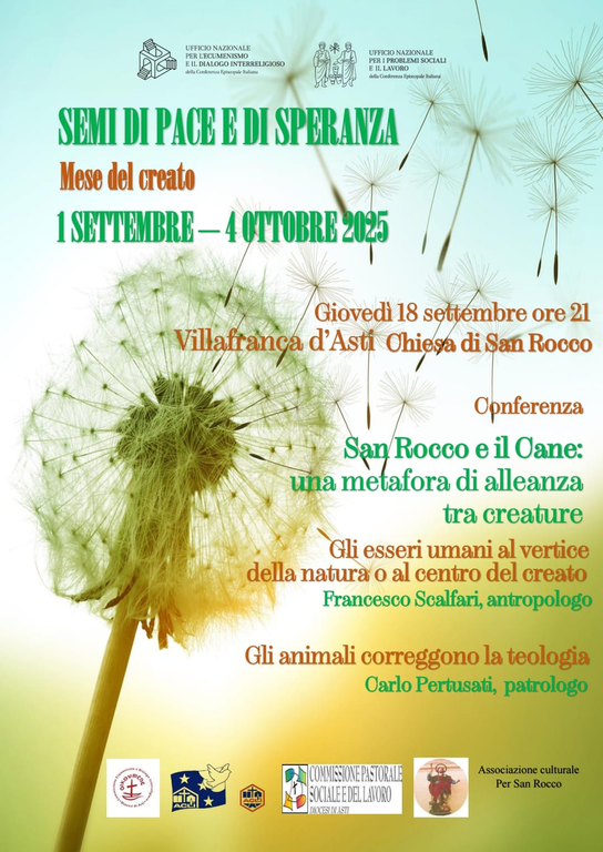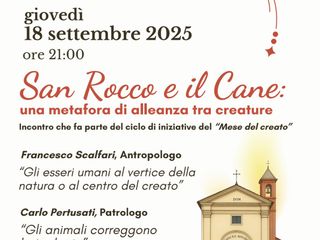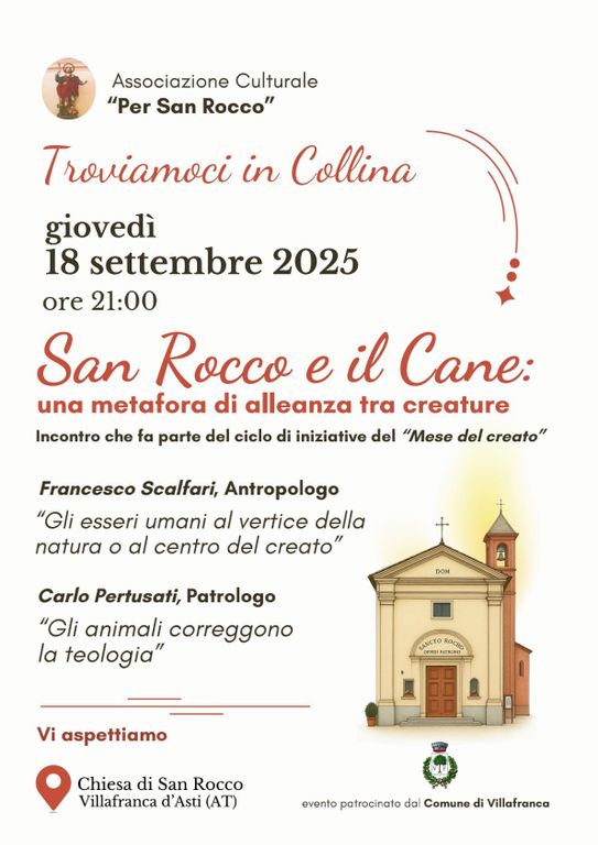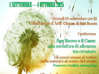 Inserita nell’ambito delle iniziative diocesane per il Mese del Creato “Semi di Pace e di Speranza”, giovedì 18 settembre, alle 21, la chiesa di San Rocco di Villafranca d’Asti ospiterà la conferenza “San Rocco e il cane: una metafora di alleanza tra creature”, curata dall’Associazione Culturale “Per San Rocco" e patrocinata dal Comune di Villafranca.