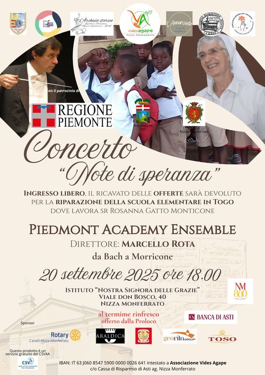 Sabato 20 settembre alle 18, il Santuario di Nostra Signora delle Grazie sarà teatro del concerto di beneficenza “Note di Speranza”, a sostegno dell’iniziativa di suor Rosanna Gatto Monticone, missionaria delle Figlie di Maria Ausiliatrice. Da anni attiva presso la Missione Salesiana di Lomé, in Togo, suor Rosanna sta portando avanti i lavori di ristrutturazione della scuola elementare, con l’obiettivo di garantire a bambini e ragazzi del luogo spazi accoglienti e sicuri.