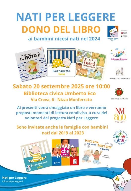 Sabato 20 settembre, alle 10, la Biblioteca civica “Umberto Eco” di Nizza Monferrato ospiterà l’iniziativa del “Dono del libro”, un progetto di “Nati per Leggere” dedicato ai bambini nicesi.