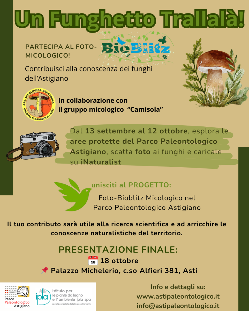 Il Parco Paleontologico Astigiano, insieme a IPLA SpA e al Gruppo Micologico “G. Camisola”, lancia l’edizione 2025 del Bioblitz Micologico: un appuntamento speciale dedicato a chiunque voglia scoprire, fotografare e contribuire allo studio dei funghi nelle aree protette e nei Siti Natura 2000 gestiti dal parco.