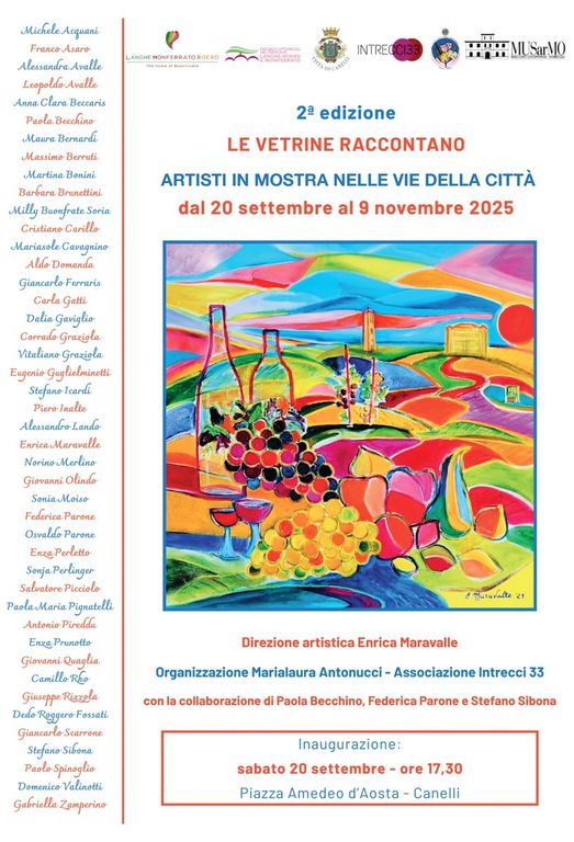 Sabato 20 settembre, alle 17.30, sull’onda del successo della prima edizione, si terrà l’inaugurazione della mostra diffusa "Le vetrine raccontano - Artisti in mostra nelle vie della città”, nata dal progetto ideato e diretto da Enrica Maravalle e organizzato da Marialaura Antonucci dell’associazione Intrecci 33, con i patrocini della Città di Canelli, del MUSarmo, del Lions Club Cultura e Solidarietà, dell'Ente Turismo Langhe Monferrato Roero e dell'associazione per il patrimonio dei Paesaggi vitivinicoli Langhe Roero e Monferrato.