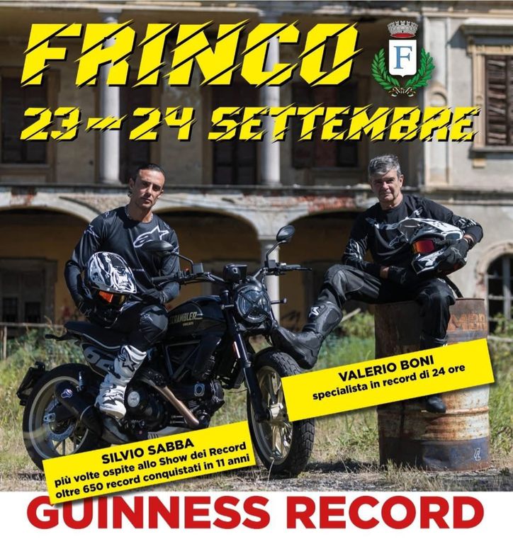 Due nomi ben noti agli amanti dei record motociclistici, Valerio Boni e Silvio Sabba, si preparano a una nuova grande sfida: tra mezzogiorno di martedì 23 settembre e mezzogiorno di mercoledì 24 settembre tenteranno di infrangere il Guinness World Record di percorrenza su moto in 24 ore su fondo sterrato.