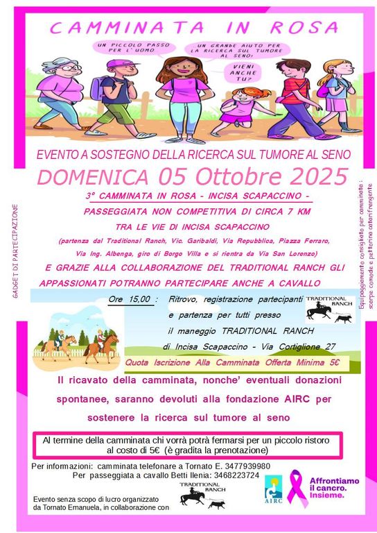 L’iniziativa, organizzata da Emanuela Tornato in collaborazione con Traditional Ranch, prevede una passeggiata non competitiva di circa 7 chilometri tra le vie del paese. Inoltre, per chi lo desiderasse, il maneggio Traditional Ranch darà la possibilità agli appassionati di partecipare anche a cavallo.