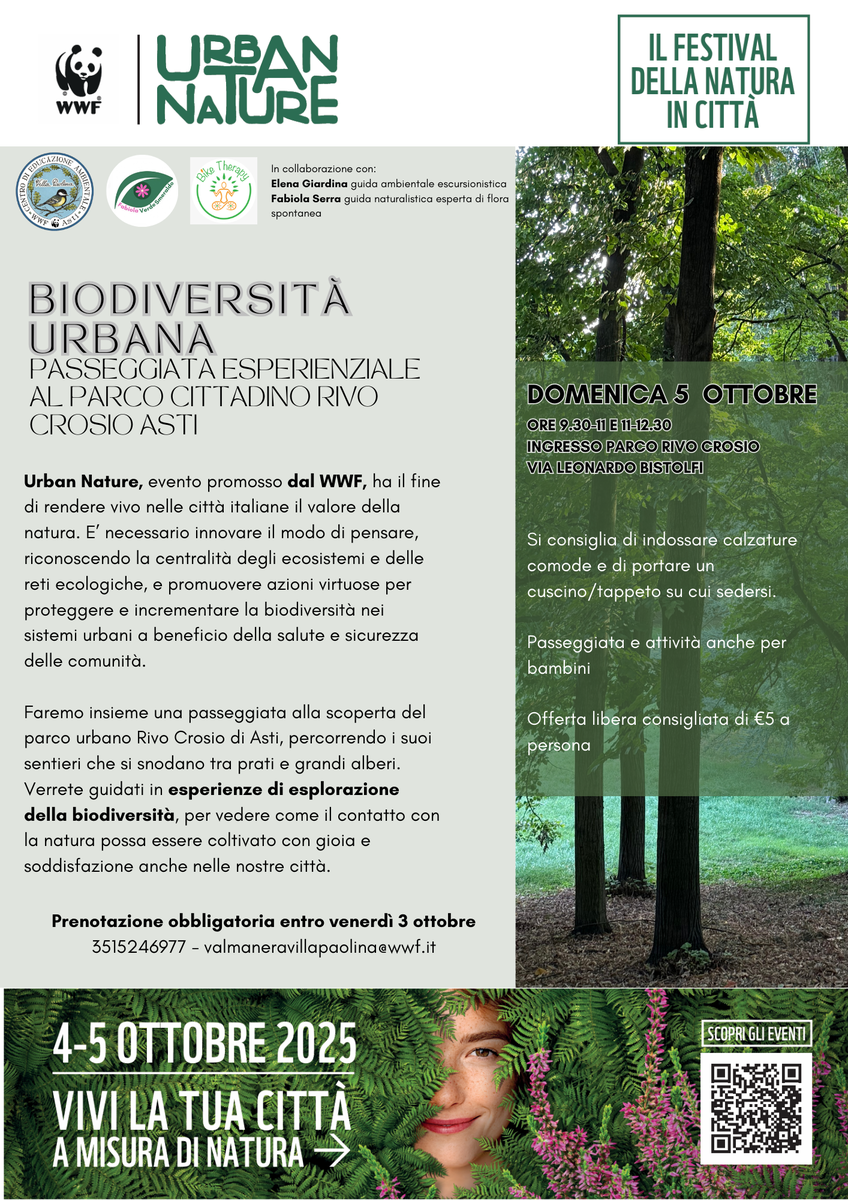Urban Nature è il festival diffuso promosso dal WWF per valorizzare la biodiversità urbana e il benessere che il verde porta nelle comunità, in programma in tutta Italia il weekend del 4 e 5 ottobre con centinaia di iniziative tra passeggiate, laboratori e citizen science.