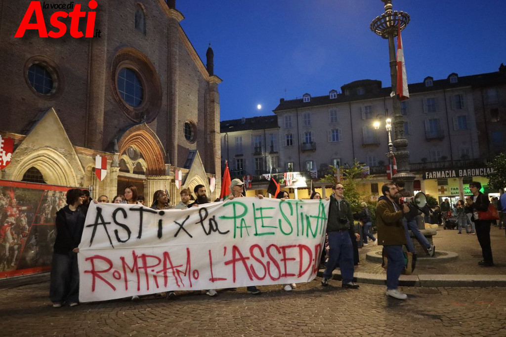 Piazza San Secondo gremita e strade del centro di Asti animate questa sera con un presidio di solidarietà al popolo palestinese, organizzato in concomitanza con il blocco della Flotilla che tentava di portare aiuti umanitari nella Striscia di Gaza. Il corteo, dopo gli interventi in piazza, si sta dirigendo verso l'ospedale cittadino per commemorare gli oltre 1700 medici e operatori sanitari uccisi a Gaza dall'inizio del conflitto.