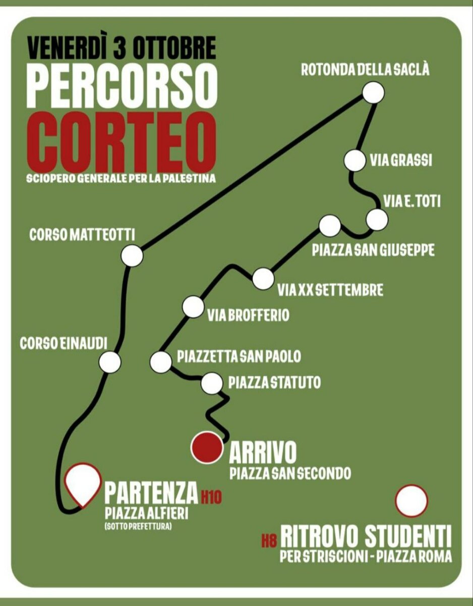 Questa mattina anche Asti, così come moltissime altre città italiane, si fermerà. Le strade saranno attraversate da un corteo in occasione dello sciopero generale proclamato su scala nazionale da Cgil e sindacati di base (Usb, Si Cobas e altri) per protestare contro la guerra a Gaza e manifestare solidarietà al popolo palestinese e agli attivisti della flottilla.
