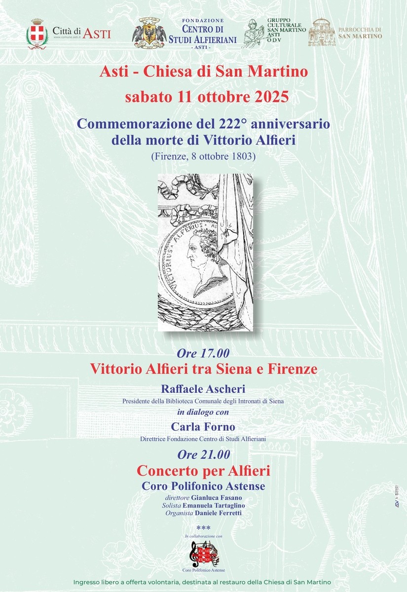 Sabato 11 ottobre, nella Chiesa di San Martino ad Asti, il Gruppo Culturale San Martino ODV, in collaborazione con la Fondazione Centro di Studi Alfieriani, propone una serata speciale per commemorare il 222° anniversario della morte di Vittorio Alfieri, scomparso a Firenze l’8 ottobre 1803.