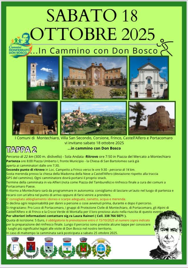 L'impegno nella promozione di un turismo lento e sostenibile non si ferma. Per gli amanti del cammino e della storia locale, il prossimo appuntamento è fissato per sabato 18 ottobre. In quella data si terrà un'escursione legata al progetto "I cammini di Don Bosco", un itinerario sui sentieri di colori, sapori e saperi per ripercorrere i luoghi attraversati da Giovanni Bosco e dai suoi ragazzi. L'evento mira a valorizzare le bellezze naturali e storiche del territorio, promuovendo al contempo una solida cultura dell'accoglienza.