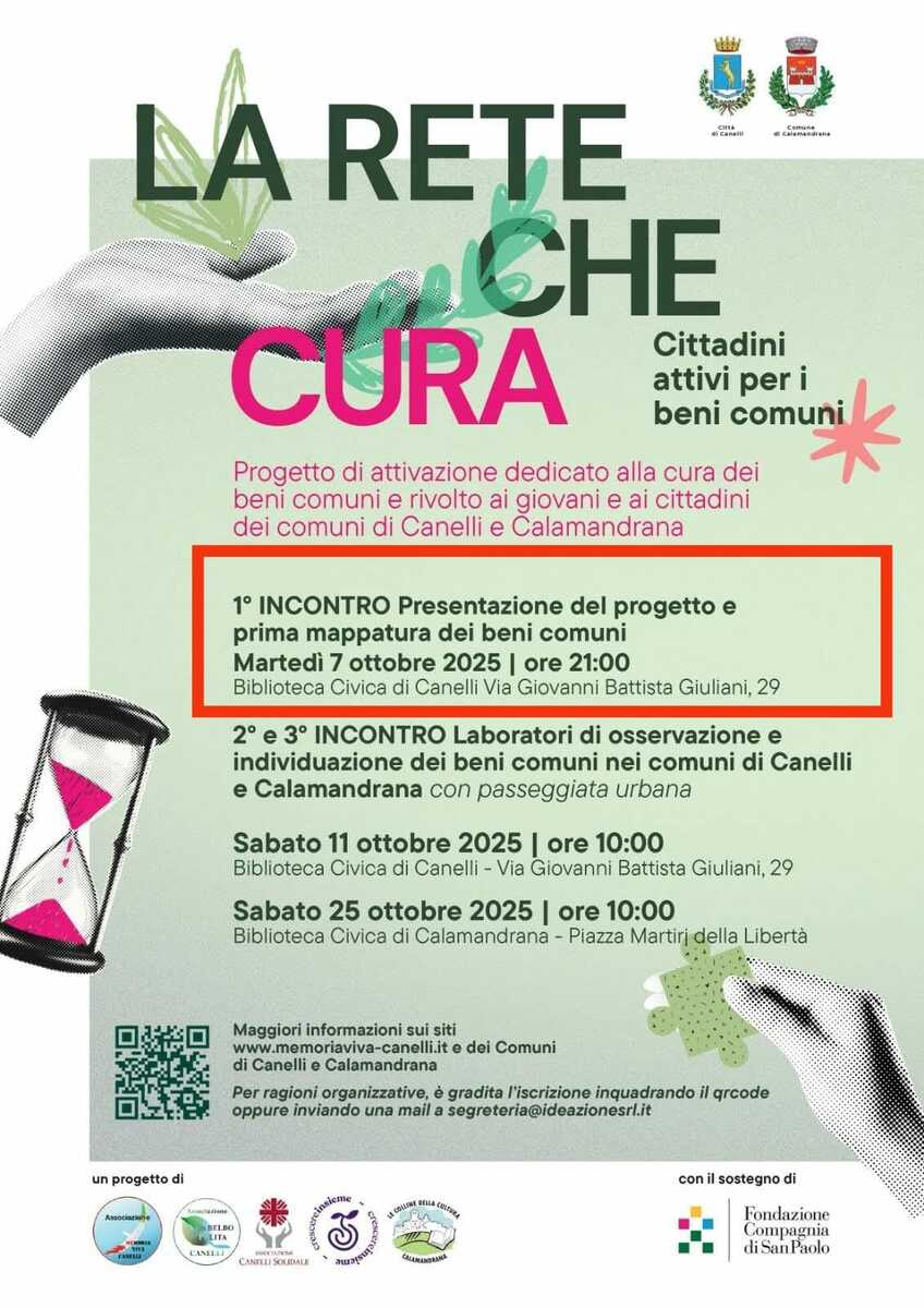 Nei Comuni di Canelli e Calamandrana prende il via oggi, martedì 7 ottobre, il progetto “La rete che cura – Cittadini attivi per i beni comuni”. L'iniziativa, promossa dall'associazione Memoria Viva, si propone di coinvolgere attivamente cittadini, giovani, associazioni e istituzioni in un percorso dedicato alla cura e alla gestione condivisa degli spazi pubblici e delle aree verdi urbane.