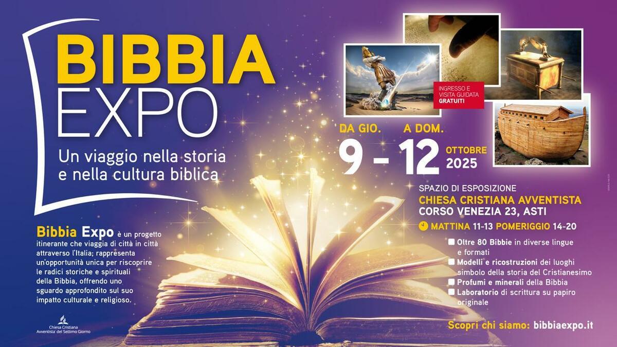Prende il via giovedì 9 ottobre ad Asti la prima edizione di BibbiaExpo, quattro giorni di mostra interattiva dedicata alla Bibbia. L'iniziativa, promossa dalla Chiesa Cristiana Avventista del Settimo Giorno in collaborazione con la Società Biblica in Italia, offrirà un percorso esperienziale tra antichi manoscritti, modelli storici e curiosità che legano il passato al presente. La mostra si terrà presso la sede di Corso Venezia 23 con ingresso gratuito.