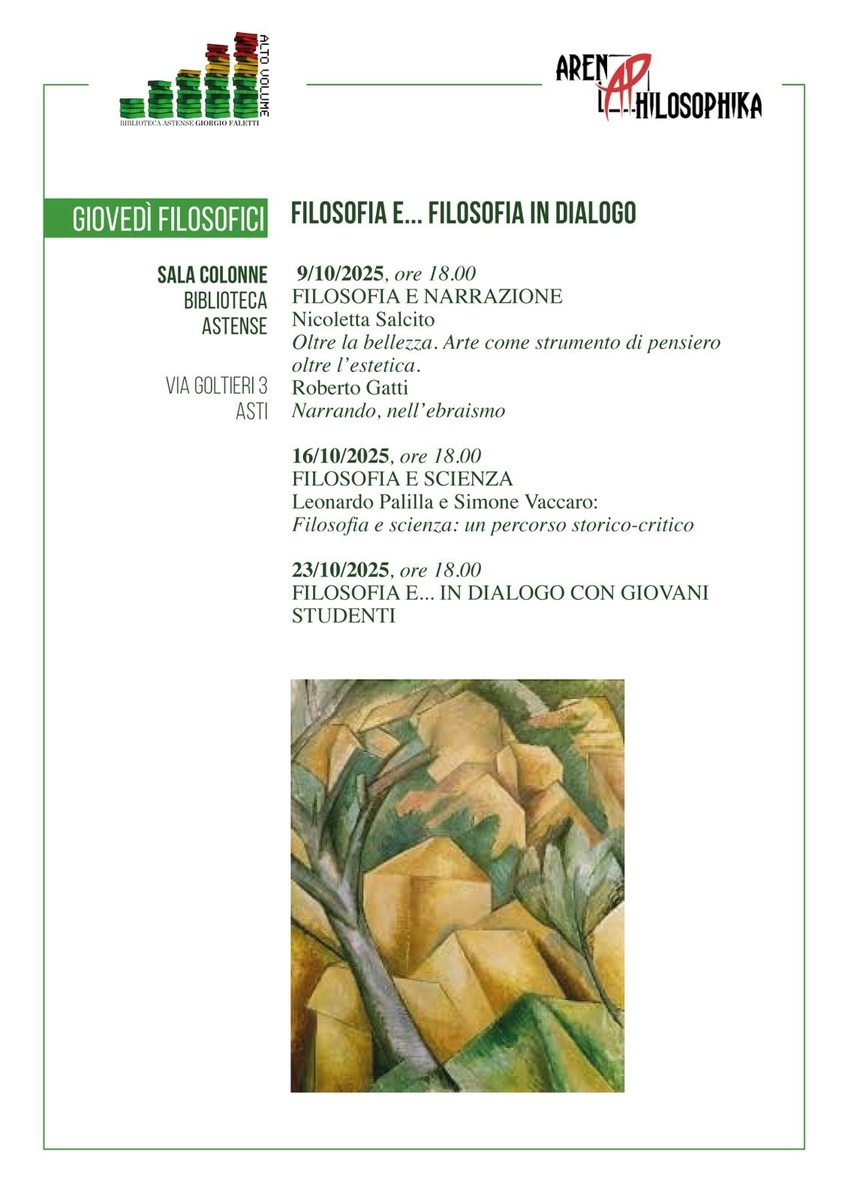 Dal 9 ottobre tornano alla Biblioteca Astense Giorgio Faletti i “Giovedì Filosofici”, realizzati in collaborazione con Arena Philosophika. “Filosofia e… Filosofia in dialogo” è il titolo del ciclo nato con l’obiettivo di far dialogare tra loro differenti forme di sapere. Naturale prosecuzione dei due cicli precedenti, quest’anno l’intenzione è quella di far scendere la filosofia dal suo piedistallo e farla entrare in confronto diretto con altre discipline, con un'attenzione particolare all'avvicinamento dei giovani.