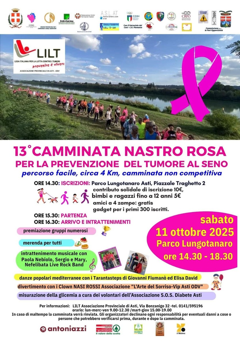 Oggi, sabato 11 ottobre, Asti torna a colorarsi di rosa. La 13ª Camminata Nastro Rosa, organizzata da LILT Asti ODV, invita tutta la città a unire passi, sorrisi e solidarietà per una causa che riguarda tutti: la prevenzione del tumore al seno. L’appuntamento è, come da tradizione, al Parco Lungotanaro (Piazzale Traghetto 2), dove dalle 14.30 prenderà vita una grande festa all’aperto che durerà fino alle 18.30.