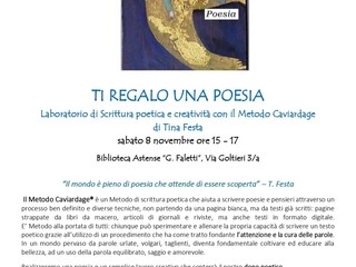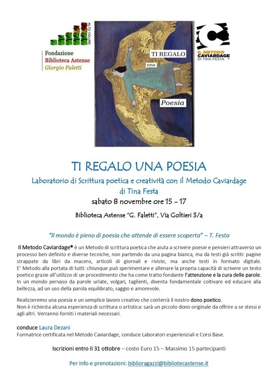 Sabato 8 novembre dalle 15 alle 17, la Biblioteca Astense Giorgio Faletti terrà un laboratorio di scrittura poetica e creatività con il Metodo Caviardage® di Tina Festa, dal titolo “Ti regalo una poesia”, condotto da Laura Dezani, formatrice certificata.