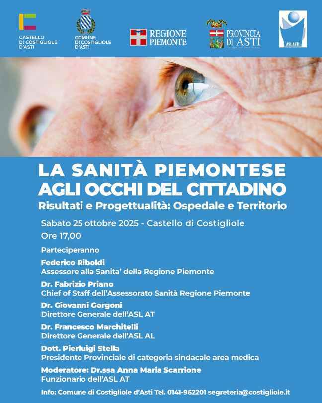 Il futuro della sanità in Piemonte, con un focus specifico sul rapporto tra ospedale e territorio, sarà al centro della tavola rotonda aperta al pubblico organizzata a Costigliole d'Asti. L'appuntamento è fissato per sabato 25 ottobre alle 17.30 nella sede del Castello comunale.