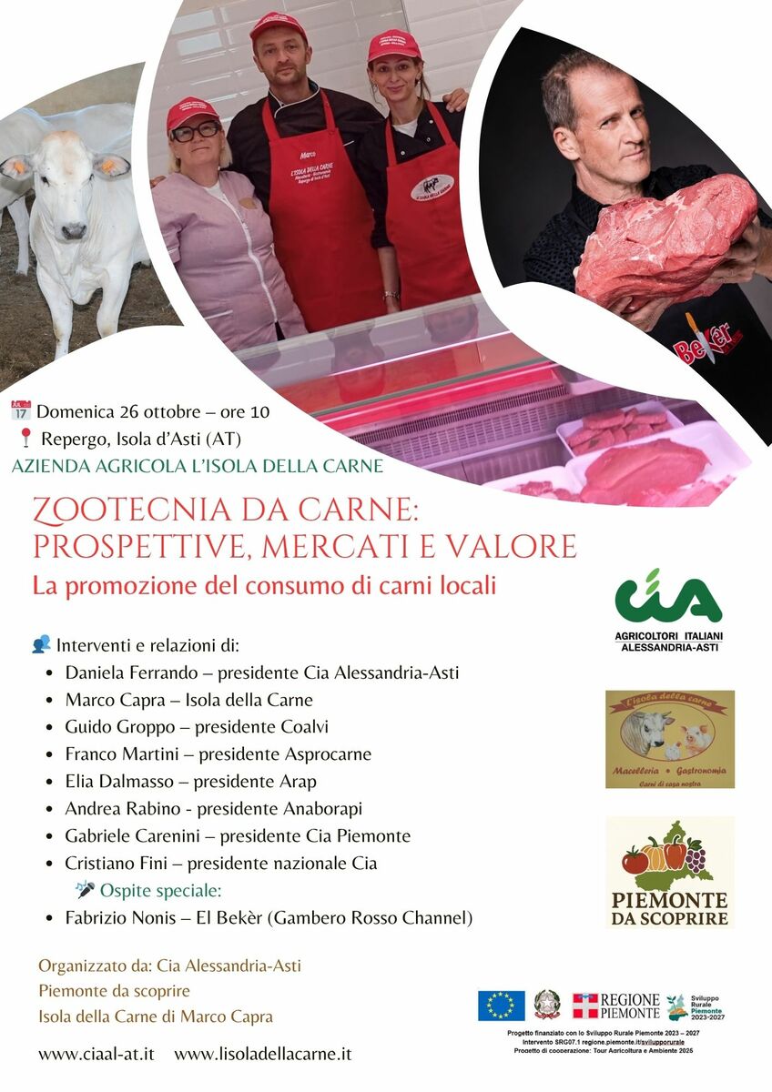 Il convegno, dal titolo “Zootecnia da carne: prospettive, mercati e valore. La promozione del consumo di carni locali”, inizierà alle ore 10 e sarà organizzato da Cia Alessandria-Asti, Piemonte da Scoprire e Isola della Carne, con il supporto della Regione Piemonte.