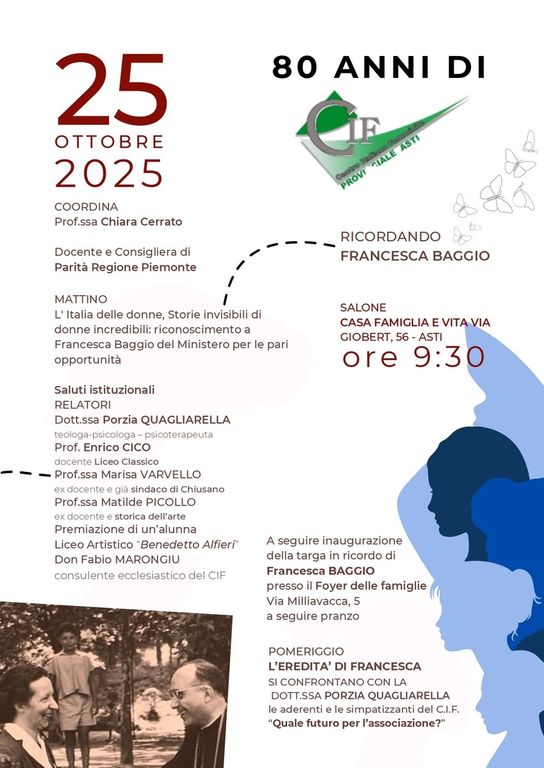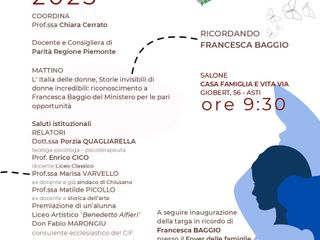 Successivamente, dopo i saluti istituzionali, interverranno Porzia Quagliarella, teologa, psicologa e psicoterapeuta; Enrico Cico, docente del liceo Classico; Marisa Varvello, ex docente e già sindaco di Chiusano; Matilde Picollo, ex docente e storica dell’arte; don Fabio Marongiu, consulente ecclesiastico del Cif, anticipando la premiazione di un’alunna del liceo Artistico “Benedetto Alfieri” e l’inaugurazione della targa a ricordo di Francesca Baggio al Foyer delle Famiglie.
