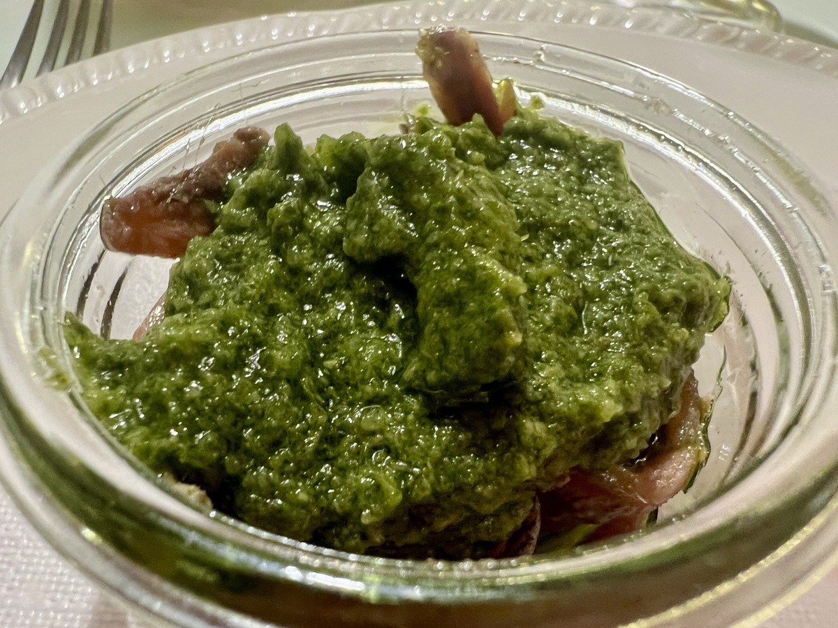 Decisamente azzeccata infatti, in un periodo in cui purtroppo andare a cena e bersi una bottiglia in due è diventato un azzardo, è la formula che consente di avviare e continuare la serata con un abbondante calice di vino servito in accompagnamento a due stuzzichini – nome a parte - non proprio mignon: L'Acciughina al Verde, dal seducente sapore essenziale e robusto,