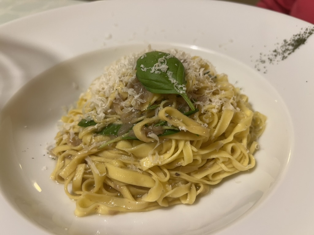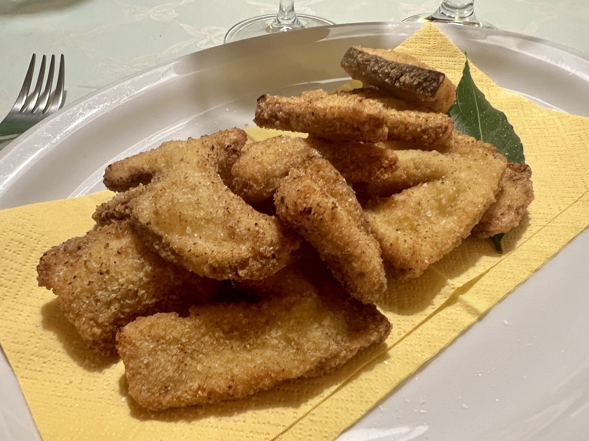 ecco i Tajarin della" Via del Sale", cotti come si deve e perfettamente amalgamati nel loro insieme. E mentre mi delizio con questi ultimi, si sente chiaramente arrivare dalla cucina lo sfrigolio nell’olio bollente di quel che sarà l’ingrediente assoluto del piatto successivo: