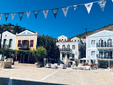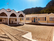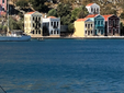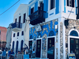 Pochi metri più in alto, una piazzetta si apre all’improvviso: tavoli di legno, un muro bianco con una sola parola scritta in nero — “Mediterraneo”. È impossibile non pensare al film di Gabriele Salvatores, girato qui e premiato con l’Oscar. Una storia di uomini sospesi tra la guerra e una terra remota che li disarma, prima ancora di accoglierli. Quella scritta non è decorazione: è memoria sedimentata, più incisiva di qualunque brochure. Attorno, muri scrostati e facciate restaurate convivono senza spiegazioni; la scena è vuota e viva allo stesso tempo, come se qualcuno dovesse comparire da un momento all’altro. Poco distante si trova la Santrapeia School, fondata nel 1903 della diaspora greca che è uno degli edifici simbolo di Kastellorizo. La sua architettura neoclassica, con colonne e timpano, testimonia il periodo di grande sviluppo a inizio Novecento, quando cultura e commercio fiorivano grazie alla posizione strategica e al momento storico. Oggi l’edificio resta un punto di riferimento solo identitario per gli abitanti.