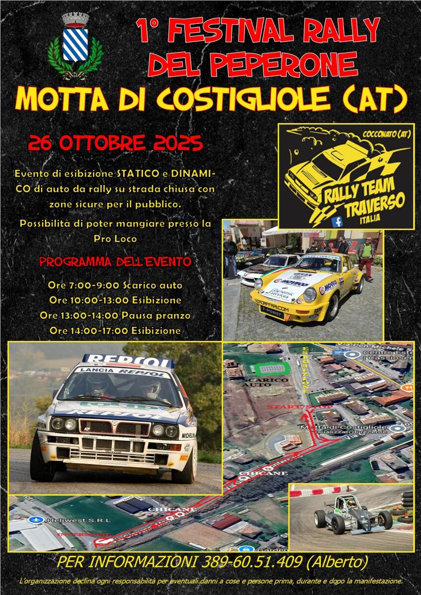 Motori accesi domani, domenica 26 ottobre, a Motta di Costigliole, dove andrà in scena la prima edizione del "Festival Rally del Peperone", un evento che promette spettacolo e adrenalina grazie alla presenza di circa 50 auto da competizione.