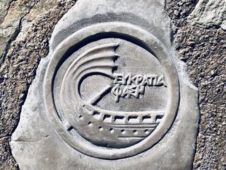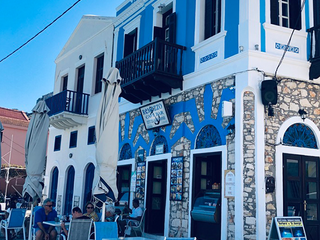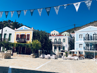 Pochi metri più in alto, una piazzetta si apre all’improvviso: tavoli di legno, un muro bianco con una sola parola scritta in nero — “Mediterraneo”. È impossibile non pensare al film di Gabriele Salvatores, girato qui e premiato con l’Oscar. Una storia di uomini sospesi tra la guerra e una terra remota che li disarma, prima ancora di accoglierli. Quella scritta non è decorazione: è memoria sedimentata, più incisiva di qualunque brochure. Attorno, muri scrostati e facciate restaurate convivono senza spiegazioni; la scena è vuota e viva allo stesso tempo, come se qualcuno dovesse comparire da un momento all’altro. Poco distante si trova la Santrapeia School, fondata nel 1903 della diaspora greca che è uno degli edifici simbolo di Kastellorizo. La sua architettura neoclassica, con colonne e timpano, testimonia il periodo di grande sviluppo a inizio Novecento, quando cultura e commercio fiorivano grazie alla posizione strategica e al momento storico. Oggi l’edificio resta un punto di riferimento solo identitario per gli abitanti.