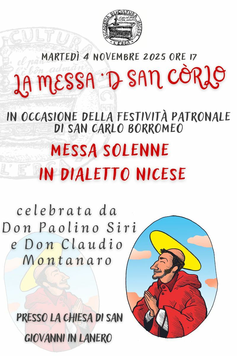 Sempre martedì 4, alle 17, la chiesa di San Giovanni Battista in Lanero vedrà la tradizionale messa in dialetto nicese in memoria del miracolo della lampada, simbolo della resistenza della città all’assedio sabaudo del 1613.