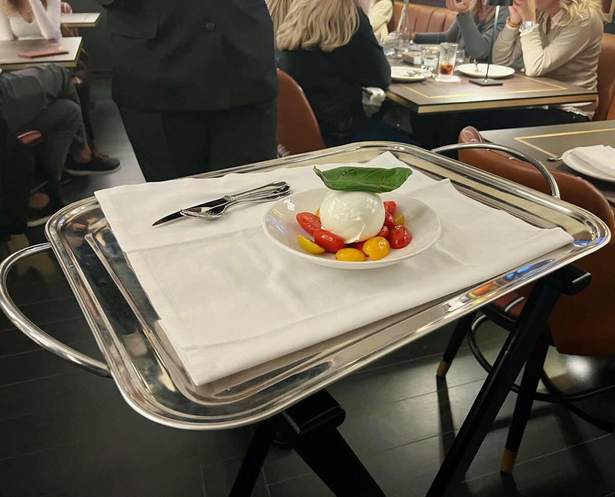 L’accoglienza è sorridente, il locale bello pieno. Lascio la mia giacca al guardaroba e, su richiesta, opto per un tavolo un po’ defilato. La musica è piuttosto alta, l’atmosfera festosa, lo stile tra il sofisticato e il vintage. Non proprio il posto che sceglierei per mangiare una pizza. Quella che mi aspetta però – lo ha detto Briatore stesso – non sarà una serata in pizzeria, ma un’esperienza. E allora che esperienza sia. L’arrivo in tavola del menu cartaceo è praticamente immediato: scritto in inglese/italiano e, per un boomer come me, a caratteri davvero troppo piccoli. Mi aggiusto col QR-code e, con chi mi accompagna, ordiniamo alcuni piatti, scegliendo dalla lista dei vini (da 40 a 1500 €, con proposte al calice da 9 a 14 €) un’etichetta di Montepulciano d’Abruzzo. Ad arrivare per primo in tavola è un buon piatto, fresco e ben costruito oltre che accompagnato da una croccante focaccia, di fresca Bufala servita con datterini rossi e gialli.