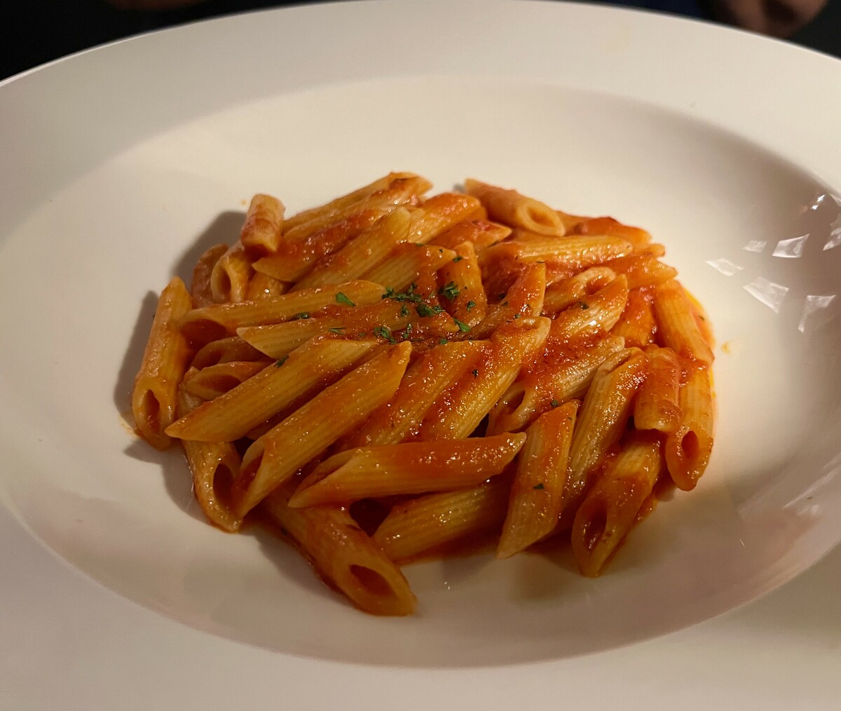 Una sorpresa le Pennette all’arrabbiata: porzione giusta, cottura al dente, piccante intenso ma non invadente, pomodoro equilibrato e privo di acidità. Un’osservazione: sincronizzare l’uscita dei due piatti avrebbe migliorato il loro arrivo in tavola.