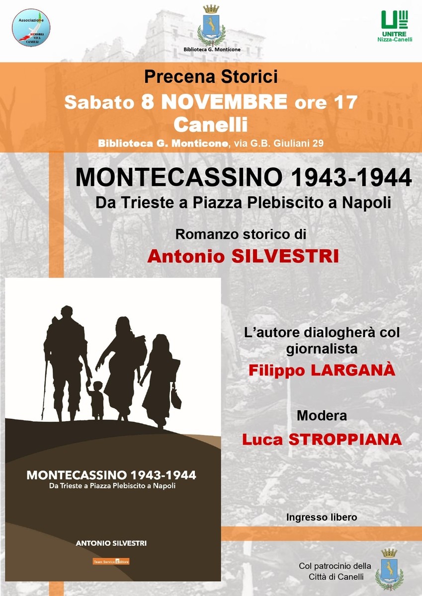 Sabato 8 novembre alle 17, la Biblioteca Monticone di Canelli accoglierà Antonio Silvestri che presenterà il suo nuovo romanzo storico “Montecassino 1943-1944 – Da Trieste a Piazza Plebiscito a Napoli”.