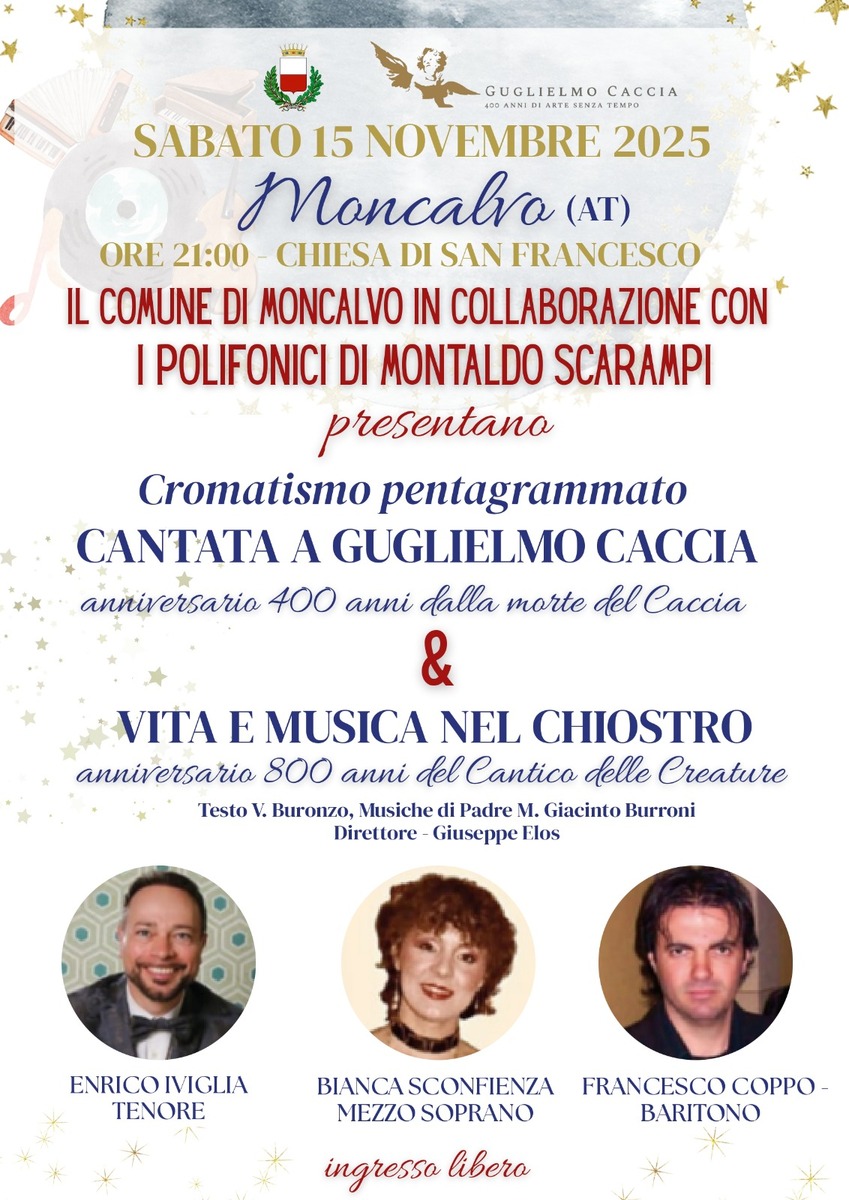 Sarà un incontro tra musica lirica, pittura e spiritualità quello che sabato 15 novembre alle 21 animerà la chiesa di San Francesco a Moncalvo. Il Comune invita cittadini e appassionati al concerto "Cromatismo Pentagrammato – Vita e musica nel chiostro e la Cantata dedicata a Guglielmo Caccia, detto il Moncalvo", uno degli appuntamenti più attesi del Festival Cacciano 2025.
