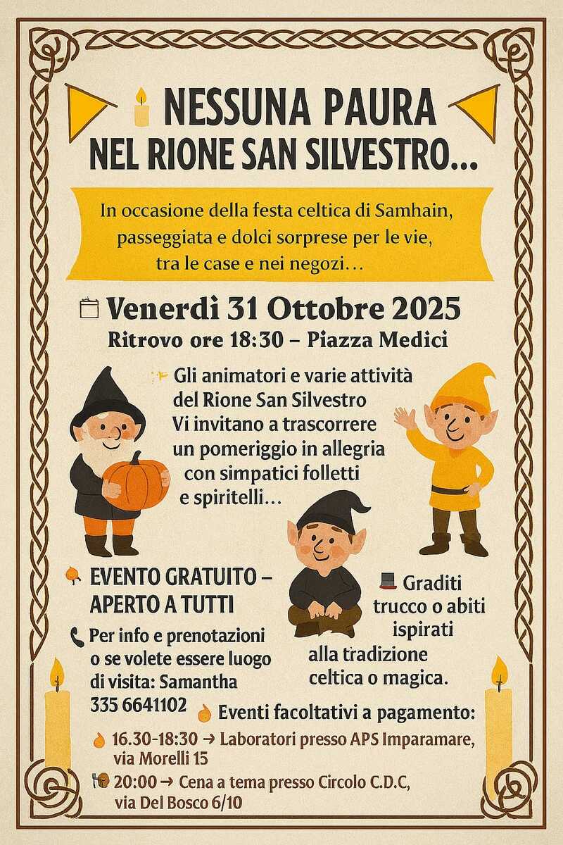 In occasione della festa celtica di Samhain, il rione San Silvestro organizza un pomeriggio di festa per venerdì 31 ottobre 2025. L'evento principale consiste in una "passeggiata e dolci sorprese" tra le vie, le case e i negozi del quartiere, in compagnia di animatori, folletti e spiritelli.